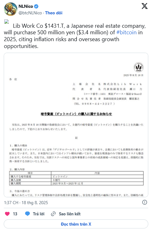 Tập đoàn xây dựng Lib Work (Nhật Bản) vừa công bố kế hoạch mua 5 tỷ yên (khoảng 34 triệu USD) Bitcoin, sau cuộc họp hội đồng quản trị ngày 18/8/2025.