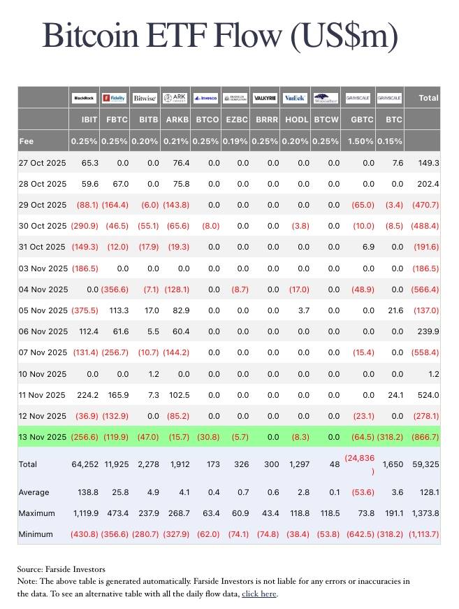 Thống kê dòng tiền inflow/outflow của các ETF Bitcoin. Nguồn: Farside Investors (14/11/2025)